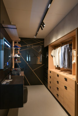 El equipo de Cubes, con su espacio Vestidor para un deportista, eligió la combinación Roble Kendal encerado y Negro con textura para el sector de ropa y objetos deportivos, y la misma madera combinada con la reproducción de material Hormigón Chicago gris oscuro para la ropa del día a día, logrando así diferenciar los espacios según su uso.