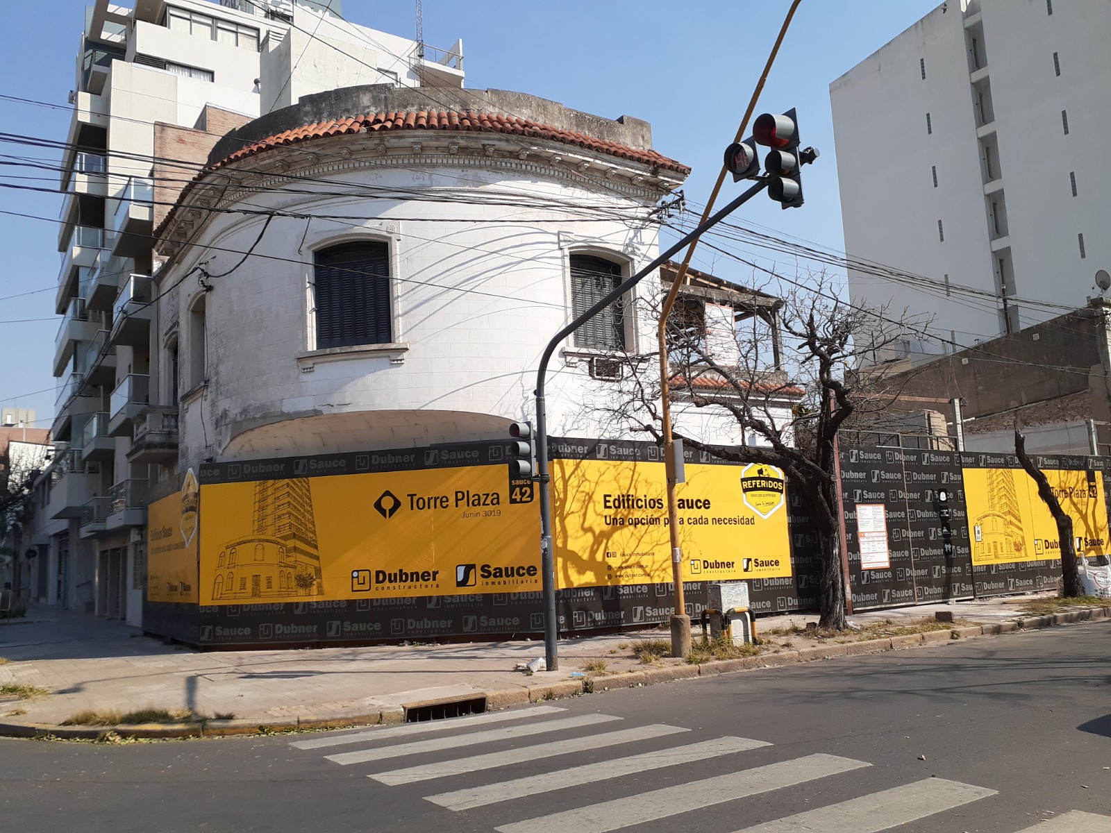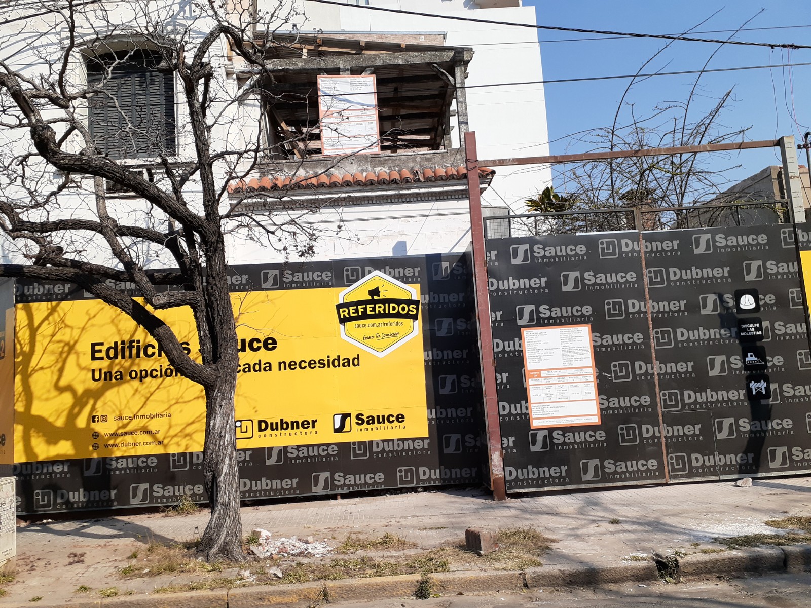 En la esquina de calle Junin y 4 de enero -de la ciudad de Santa Fe- ya colocaron el vallado de obra del SAUCE 42 de la firma DUBNER.